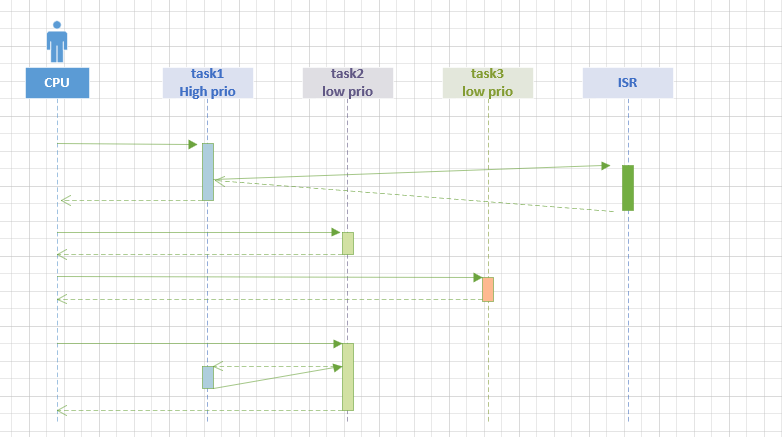 优先级说明: ISR > task1 > task2 = task3, ISR 为中断服务,比如GPIO 中断。
